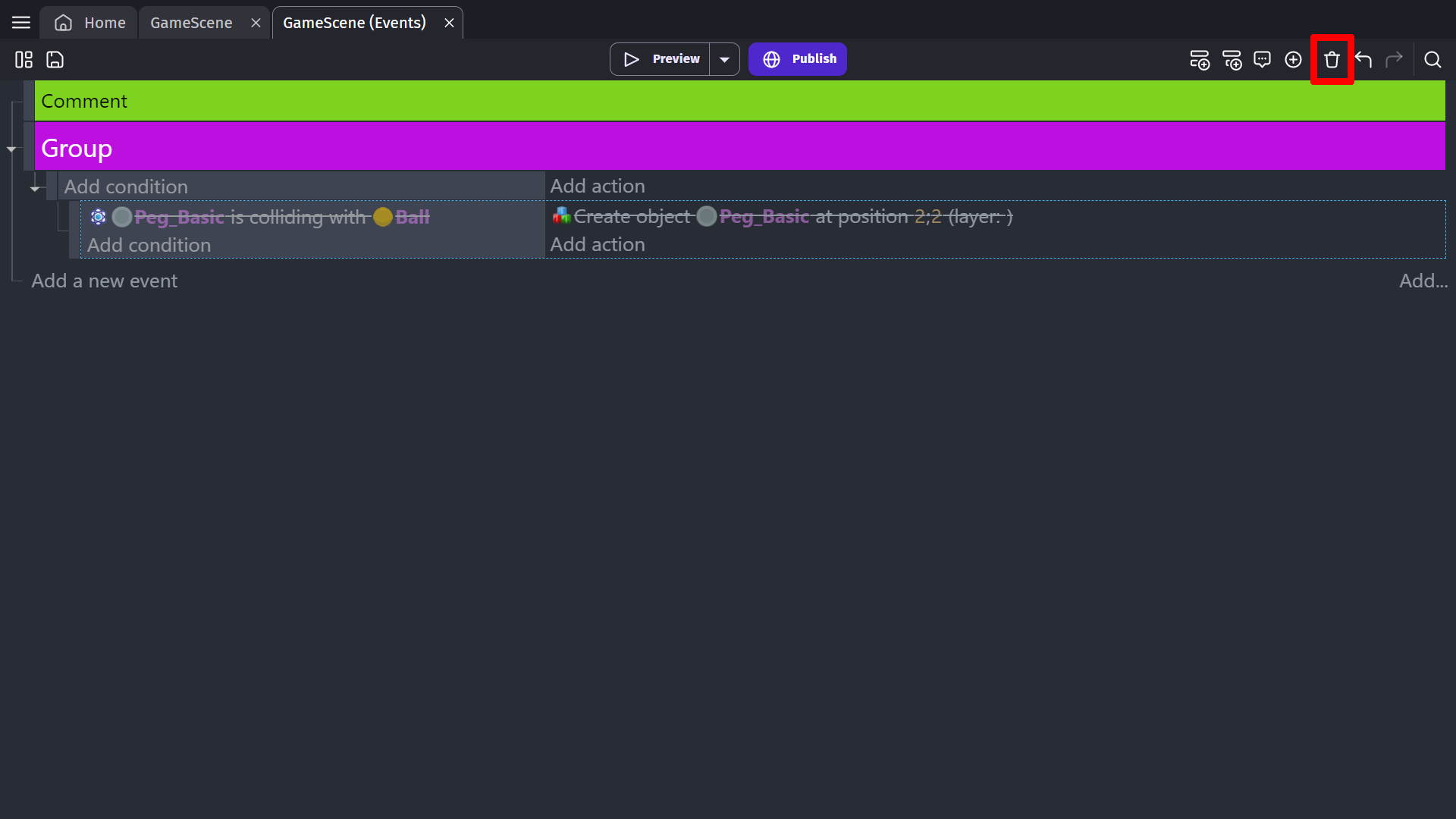 By clicking the Delete selected events button, selected events will be removed from the event sheet, as well as any subevents. (you can also press the Delete key)