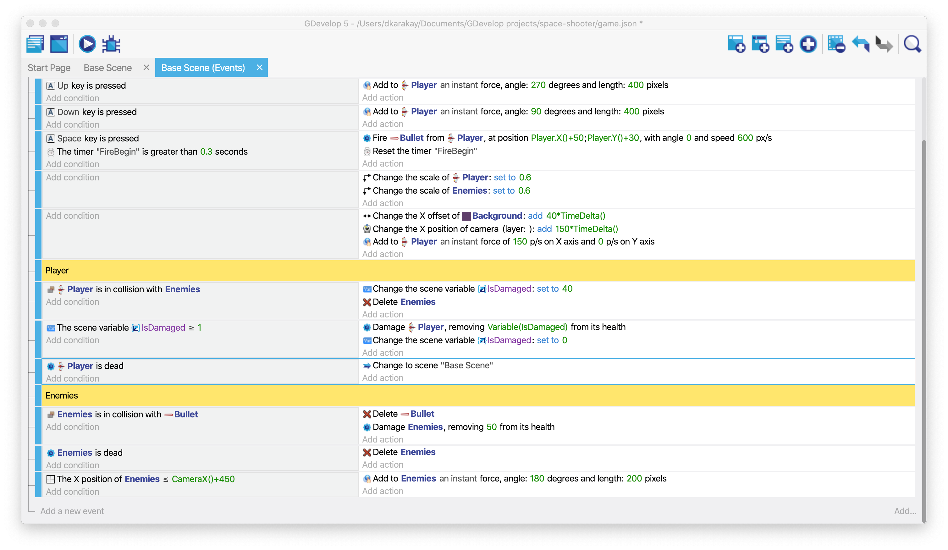 We will start adding a new condition to determine the collision between the player and the enemies. Follow the same procedure in the above.